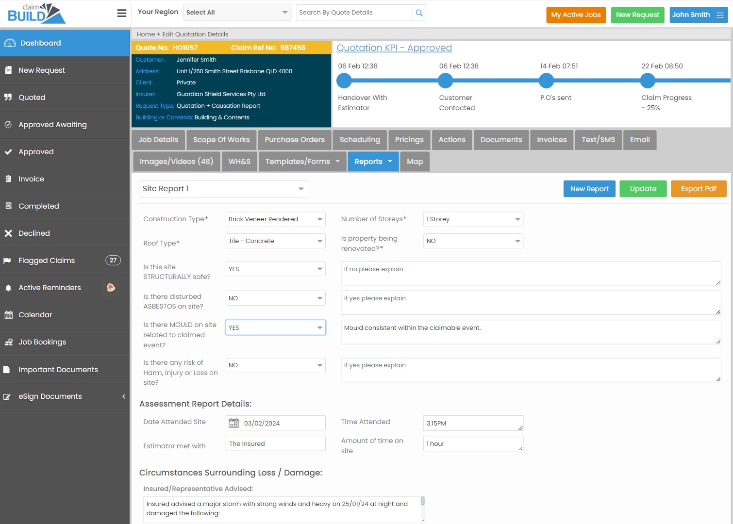 Access over a dozen specialised reports to keep your information up to date on every claim event. Whether it’s a site report, roofing report, or a relevant contents inventory report, ClaimBuild has you covered.